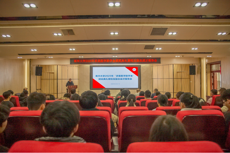 12月27日下午3点,南华大学2025年求是医学助学金颁奖典礼暨校友励志成才报告会在医研楼会议室准时召开。本次会议旨在感恩校友的母校情怀,激励同学们在爱的滋养下努力向前。出席本次会议的有衡阳医学院常务副院长屈顺林,教育发展与校友联络办公室主任李先国,衡阳医学院党委副书记卢清华,基础医学院副院长谢巍,2011届杰出校友唐建明。