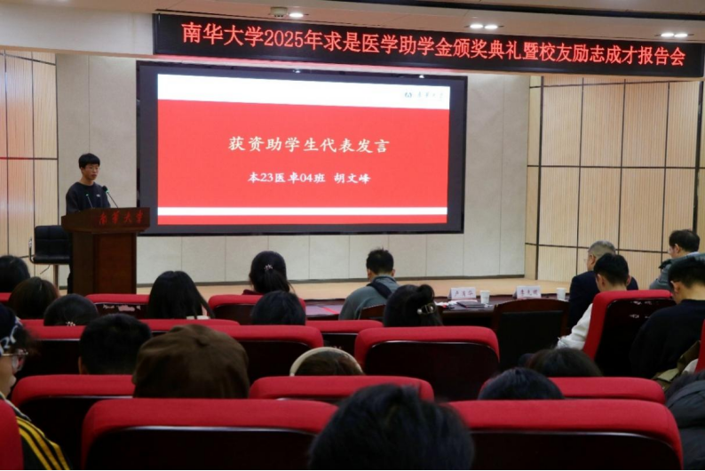 之后,学生代表本23医卓04班胡文峰进行了发言。他回忆了自己的求学生涯,虽然曾面临诸多挑战,但始终得到学校的悉心栽培与国家政策的有力扶持。他对慷慨设立助学金的南华校友表达了最由衷的谢意,并郑重承诺,将心怀感恩、不负期许,在医学道路上坚定信念、刻苦钻研,以实际行动回馈学校与社会的关爱。