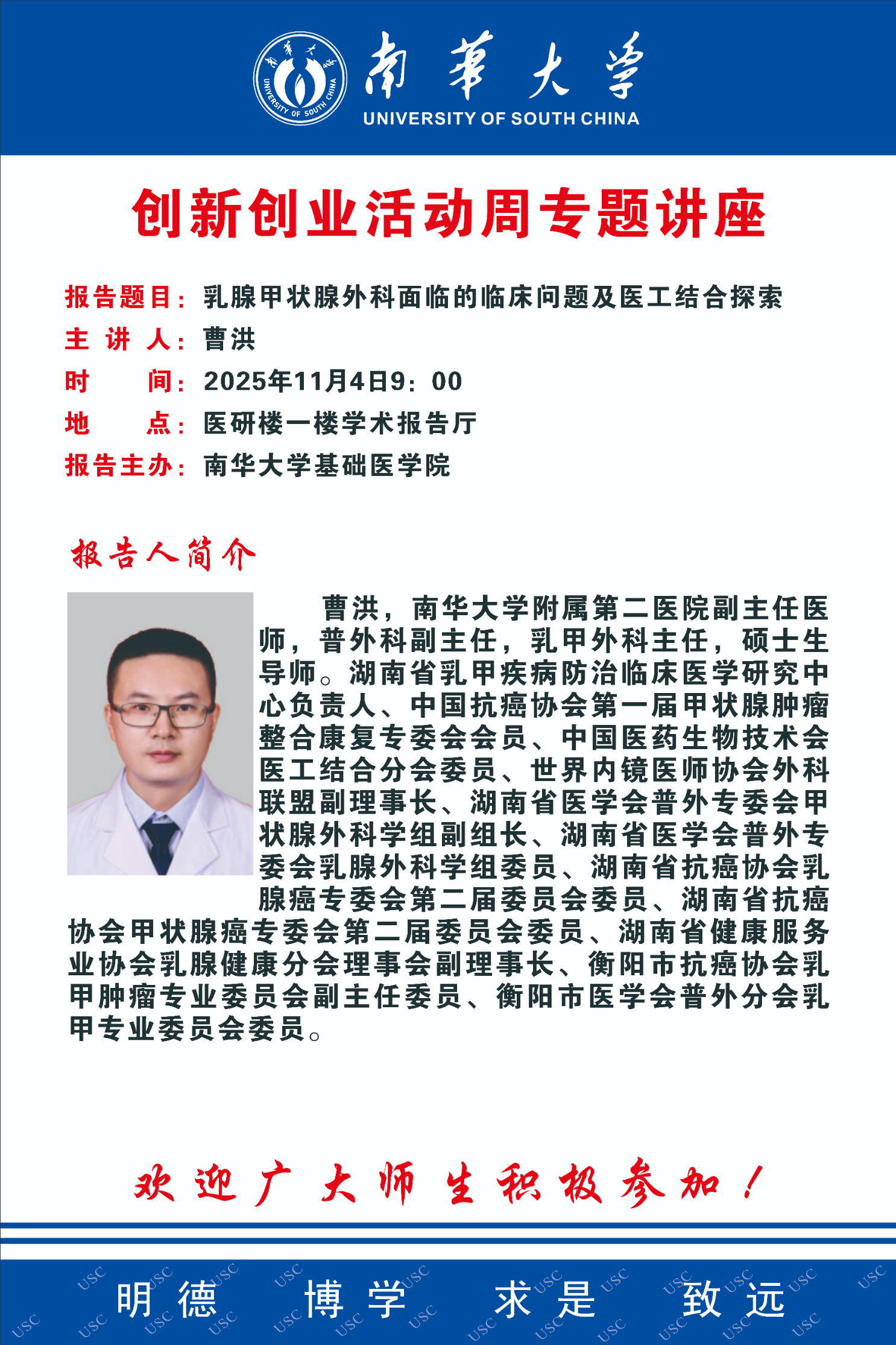 创新创业活动周专题讲座 | 曹洪:乳腺甲状腺外科面临的临床问题及医工结合探索