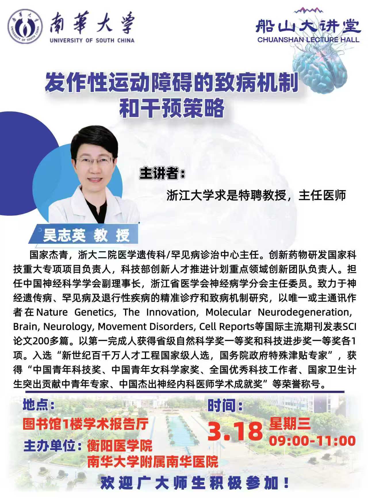 船山大讲堂 | 伍志英教授:发作性运动障碍的致病机制和干预策略