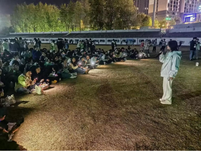 游戏热度为歌唱环节注入更强活力,第二轮演唱堪称“集体共鸣时刻”。《至少还有你》的深情让新生们默契对视,《身骑白马》的闽南语唱段引发全场跟唱,吉他弹唱《我最亲爱的》让温情随晚风流淌,《在你身边+Mr.Forgettable》的轻快转调又让氛围重回明快。此刻的演唱已超越单纯表演,成为新生情感表达的载体,有人摇摆附和,有人轻声跟唱,音乐的纽带让心与心的距离不断拉近。