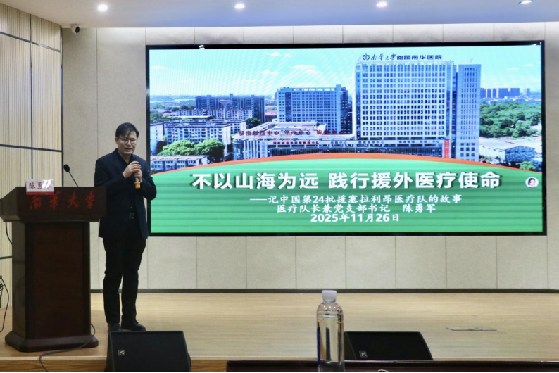 陈勇军教授深情回顾了带领第24批援非医疗队在非洲塞拉利昂执行医疗任务的艰辛历程。在设备匮乏、传染病高发、政局不稳的复杂环境中,医疗队扎根塞中友好医院,完成门诊2.2万人次、住院治疗1200人次、手术400余台的医疗工作,并在当地开展多项首创手术。队员们克服战乱、停电、断水的艰难困苦,用手机照亮手术台,开展义诊宣教2000余人次,培训本地医护人员200余名,推动25人赴华进修,留下“带不走的医疗队”。援塞医疗队的卓越贡献获塞拉利昂政府高度认可,为南华大学获评全国援外医疗工作先进单位汇聚了力量。