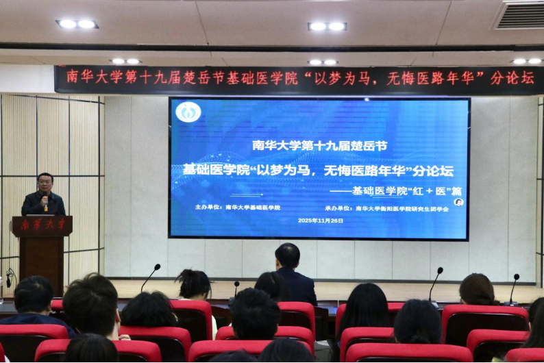 为加强研究生思政教育,11月26日,11月25日下午,南华大学第十九届楚岳节基础医学院“以梦为马,无悔医路年华”分论坛“红+医”第二篇章在医研楼一楼学术报告厅顺利举行。