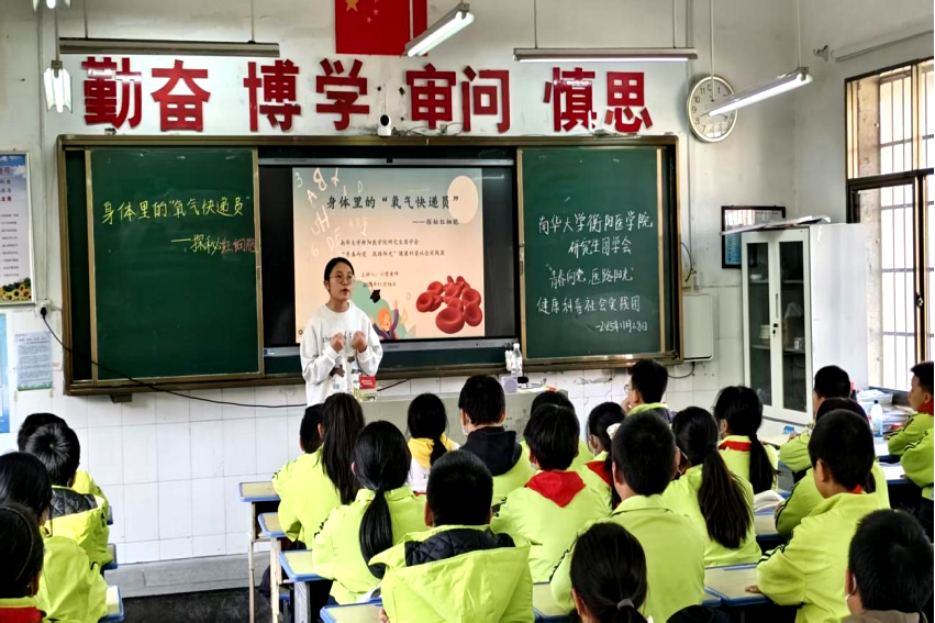 为服务健康中国战略,为儿童普及健康科学知识,促进研究生综合素质能力提升,11月28日,南华大学衡阳医学院研究生“青春向党医路阳光”健康科普社会实践团走进蒸湘区实验小学六年级(1)班,开展了一场生动有趣的红细胞科普讲座。主讲人小曾老师以“身体里的‘氧气快递员’”为主题,带领同学们探索红细胞的奥秘。