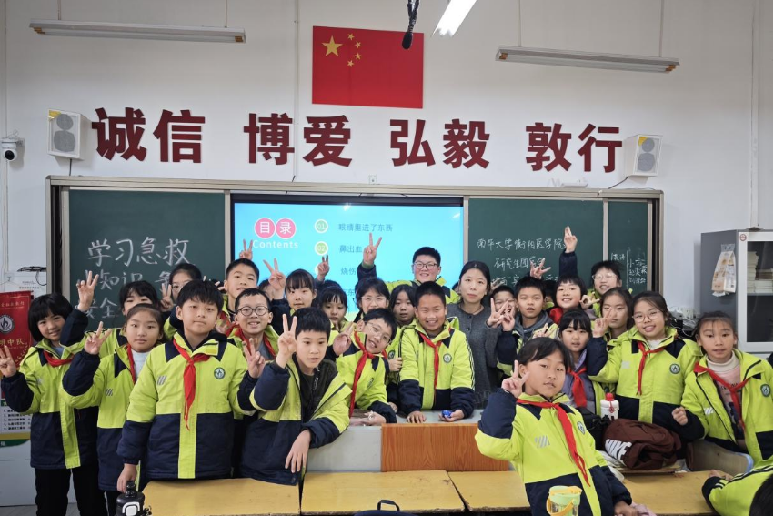 2025年12月30日上午,南华大学衡阳医学院“医路护苗”实践育人活动团队走进蒸湘区实验小学,为五年级(8)班的同学们带来了一场生动实用的急救安全小课堂。通过情景模拟、互动演示等活动形式,帮助孩子们掌握在突发情况中保护自己与他人的正确方法。