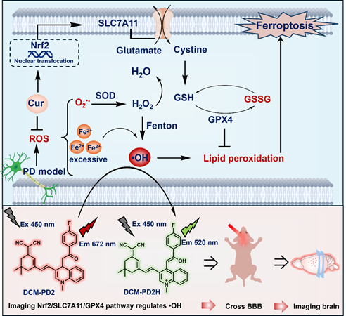 帕金森病(Parkinson's disease, PD)是一种常见的神经退行性疾病,其发病机制复杂。近年来,铁死亡作为一种由铁调控、脂质过氧化驱动的细胞死亡方式,被认为与PD的发生发展密切相关。羟基自由基(•OH)的过量积累会引起严重神经损伤,并与多种神经退行性疾病相关,但其在PD中的作用尚未得到明确阐释。受限于缺乏有效的检测工具,目前尚无能够在铁死亡及PD过程中实时监测•OH动态变化的荧光探针。在此背景下,南华大学药学院医用荧光材料团队设计并合成了一系列•OH响应型比率近红外(NIR)荧光探针(DCM-PD1~8),用于监测铁死亡介导的PD中•OH水平。研究发现,其中DCM-PD2表现出最佳的光物理性质,具备高灵敏度(检测限约22.9 nM)、优异选择性、30分钟以内的快速响应速度及良好的深层组织穿透能力。凭借出色的膜通透性和低毒性,DCM-PD2可同时用于追踪内源性和外源性•OH变化。更为重要的是,该探针能够顺利穿越血脑屏障(BBB),首次实现对PD模型小鼠脑部•OH活性的实时成像,结果显示PD小鼠脑区•OH水平显著升高。此外,利用DCM-PD2成功揭示了姜黄素(Cur)在PD模型中的神经保护作用,其主要通过Nrf2/SLC7A11信号通路调控铁死亡过程,从而减轻神经损伤。该研究不仅为理解•OH在PD中的作用机制提供了新的证据,也表明DCM-PD2是一种可靠且高效的工具,有望应用于铁死亡介导的PD的精准诊断与治疗。研究成果为探索新型PD诊断成像手段和干预策略提供了重要理论依据和实验基础。