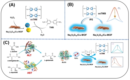 图1基于ALT/AST-GLOX-Na2V6O16/CuMOF多酶级联反应检测ALT和AST原理图(图片来自Analytical Chemistry)