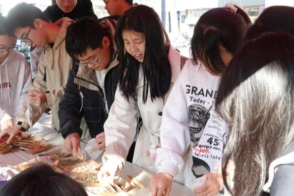 本次活动精心设置了“穴位寻踪大挑战”“药养五脏”“Emoji 猜药”“药语飞花令”等多个特色区域,以寓教于乐之法传递中医药文化。同学们在人体模型上精准定位合谷、足三里等穴位,或参与药材记忆问答、中药 Emoji 猜谜之趣……在趣味投壶中巩固药性知识,沉浸式领略传统中医药的独特魅力。