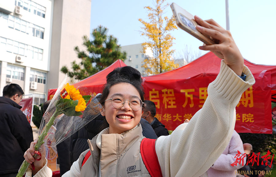 12月10日,南华大学衡阳医学院学生举起夺魁上岸的花朵自拍。2026年全国硕士研究生招生考试临近,该校特别为备考考生组织了一系列丰富多彩的减压活动,并给同学们送上鲜花、水果、吉祥物等礼品,帮助考生释放压力,调整心态,以最佳状态迎接考试。曹正平 陈文 摄影报道(湖南图片库)